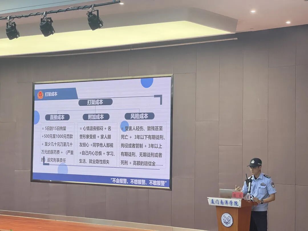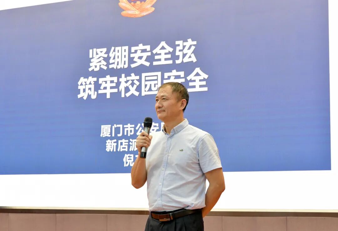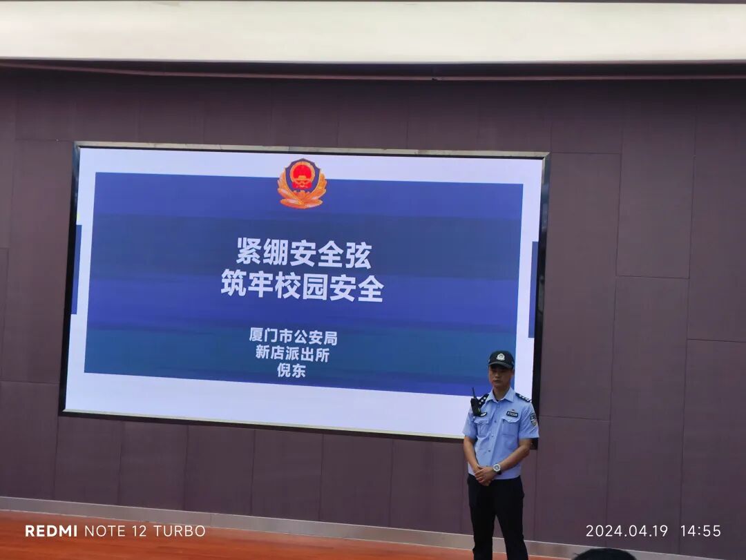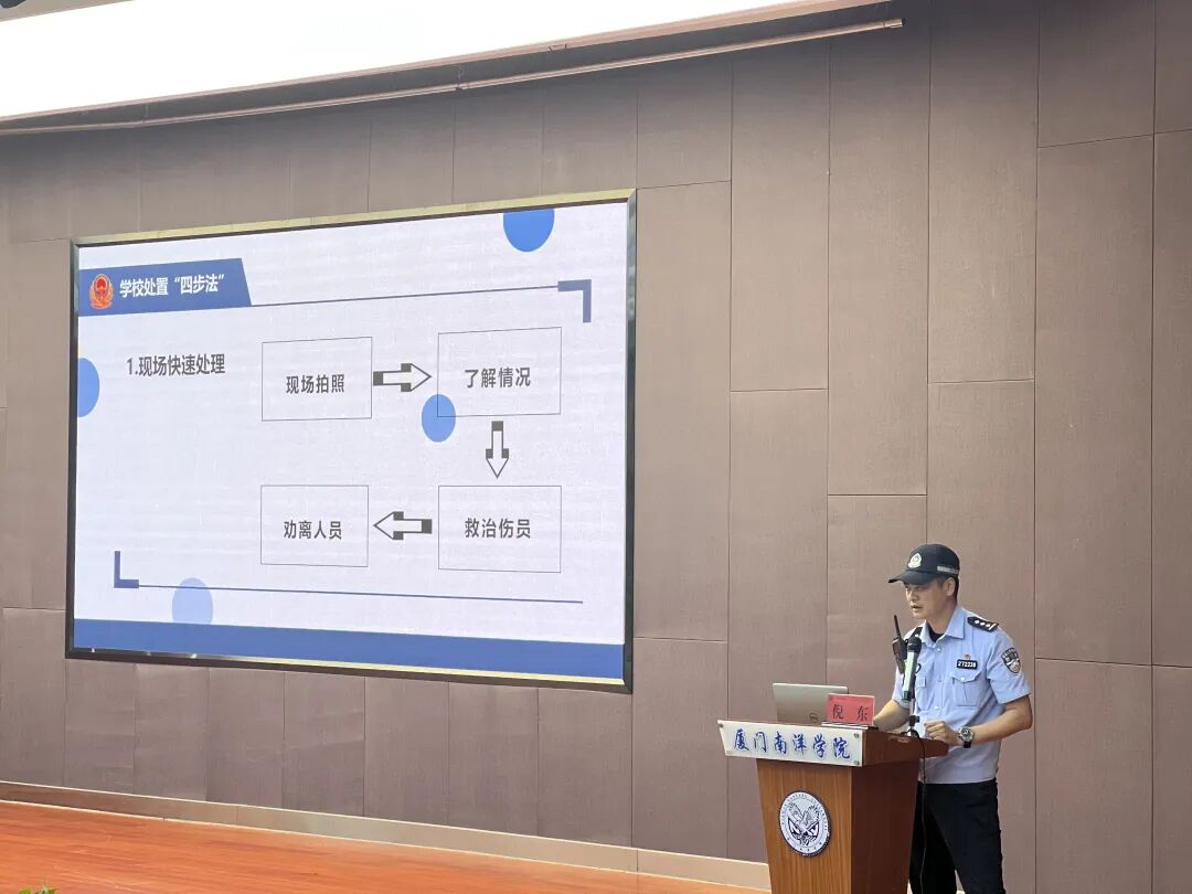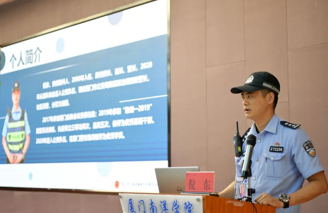 2024年4月19日下午,我校综治(法治)副校长、厦门市公安局新店派出所倪东警官走进南洋学院报告厅,给我校学工干部、全体辅导员、全体保卫人员以及部分学生干部开展主题为“紧绷安全弦,筑牢校园安全”的安全培训讲座。我校执行董事长鲁晓芹、校长助理蓝德森亲临现场聆听。后勤保卫处副处长王慧军主持。
