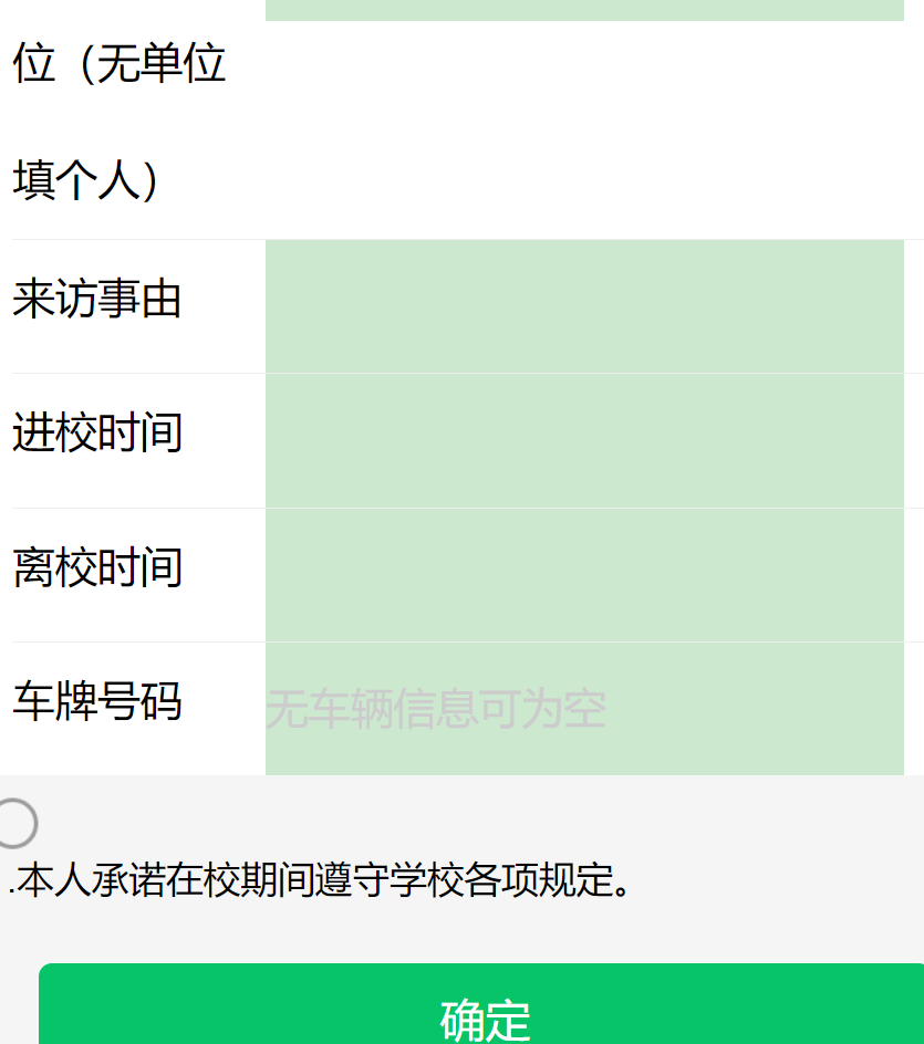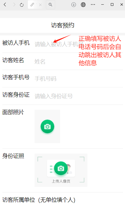 页面上填写被访人电话号码后,点击其他需要填写的栏目,页面自动弹出被访人其他信息(包括被访人的一卡通编号、被访人部门、被访姓名等信息),核对无误后填写其他访客信息,填写完毕后,点击确定按钮进行提交