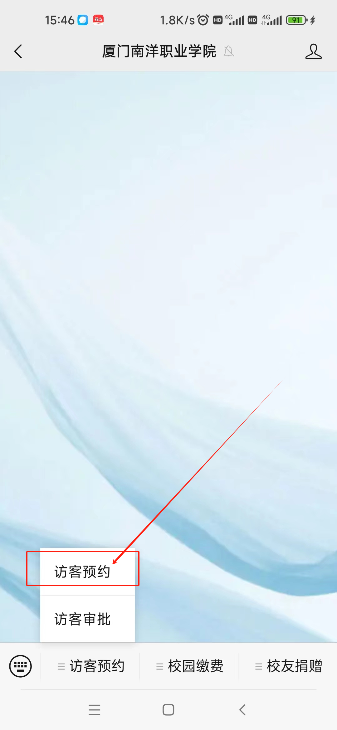 访问:http://xmnyfk.ny2000.com/member/visit或者微信搜索并关注公众号:厦门南洋职业学院---------->点击:访客预约 后进入页面