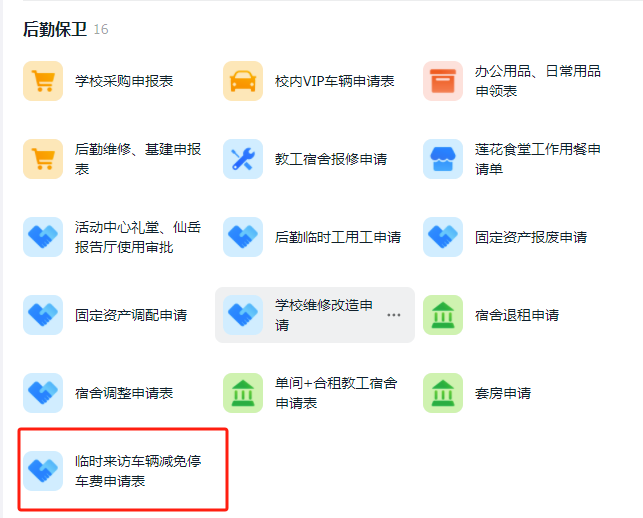 二、并非所有预约来访的客人车辆均为“免费停车”对象,需要对车辆免收停车费的,还须请被访人通过钉钉提交申请后主动联系保卫部门处理。钉钉审批页面链接位置:钉钉APP——工作台——OA审批——后勤保卫——临时来访车辆减免停车费申请表